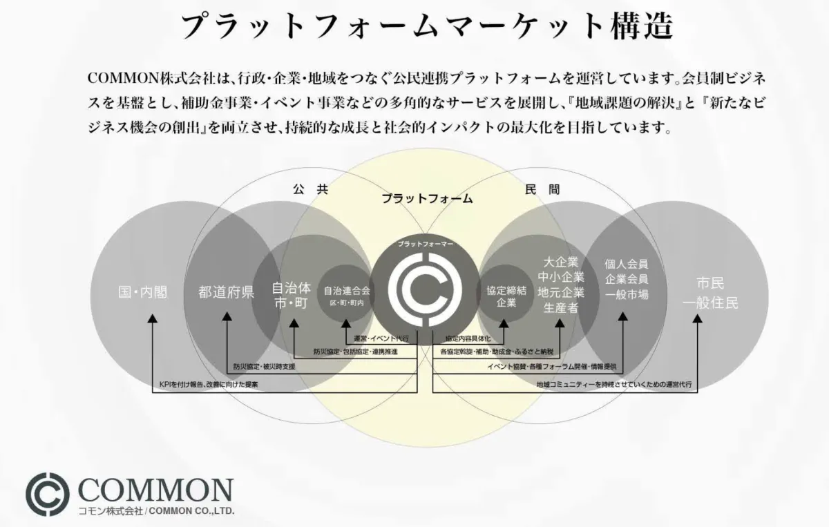 少子高齢化や防災、観光振興、産業活性化といった地域課題は、年々複雑化しています。多くの企業はCSRやESG、SDGsへの取り組みを考慮していますが、具体的な事業化モデルが不明瞭であったり、自治体との接点がなかなか得られないという課題を抱えています。これを解決するために、COMMON株式会社は公民連携のプロジェクトを数多く創出し、地域総体的なアプローチを追求しています。