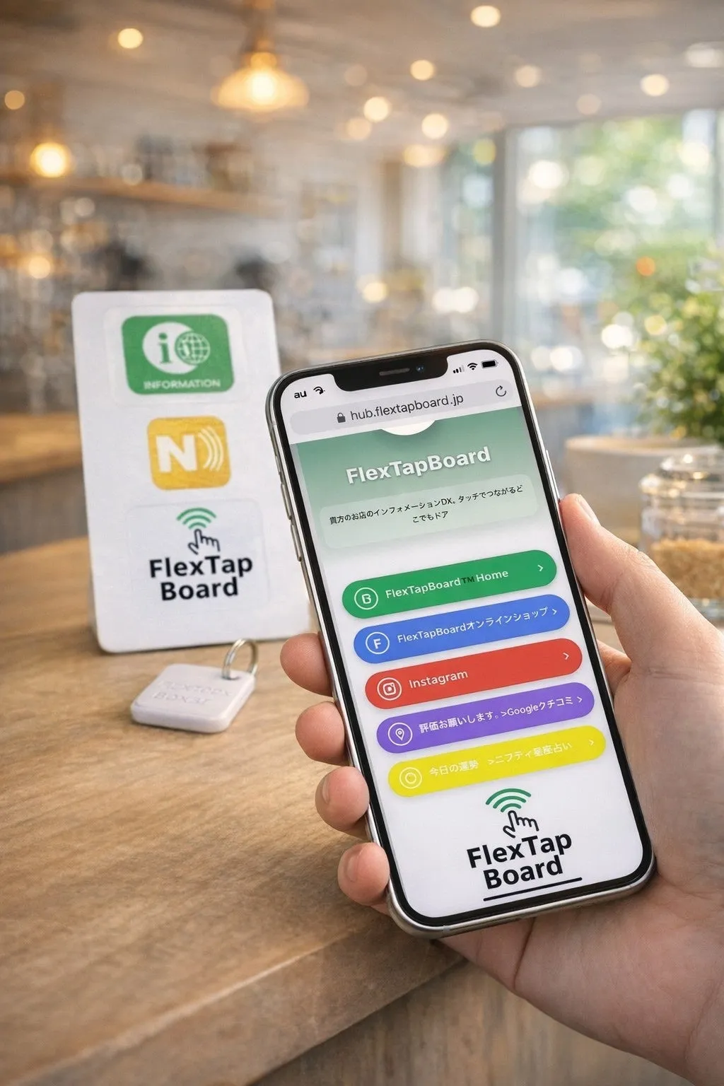 「FlexTapBoard」は、スマートフォンをかざすだけで、様々な情報にスムーズにアクセスできるNFC案内サービスです。需要に応じて、施設案内や多言語ページ、予約ページ、SNS、公式サイト、さらにはGoogleマップへのリンクに誘導します。特に新しいシステムを構築することなく、既存のコンテンツを活かすことができる点が大きな魅力です。