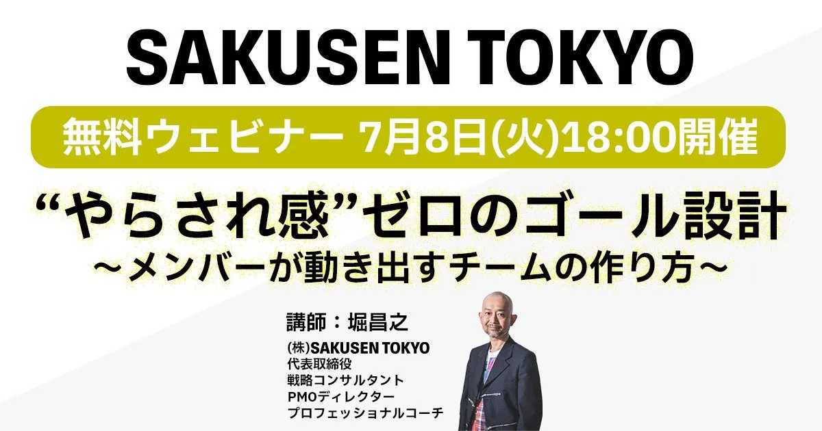 2025年7月8日、株式会社SAKUSEN TOKYOが自社主催の無料ウェビナーを行います。タイトルは「“やらされ感”ゼロのゴール設計 〜メンバーが動き出すチームの作り方〜」。このウェビナーは、18:00からスタートし、参加者は事前に申込みを行い、Zoomを通じて参加する形になります。