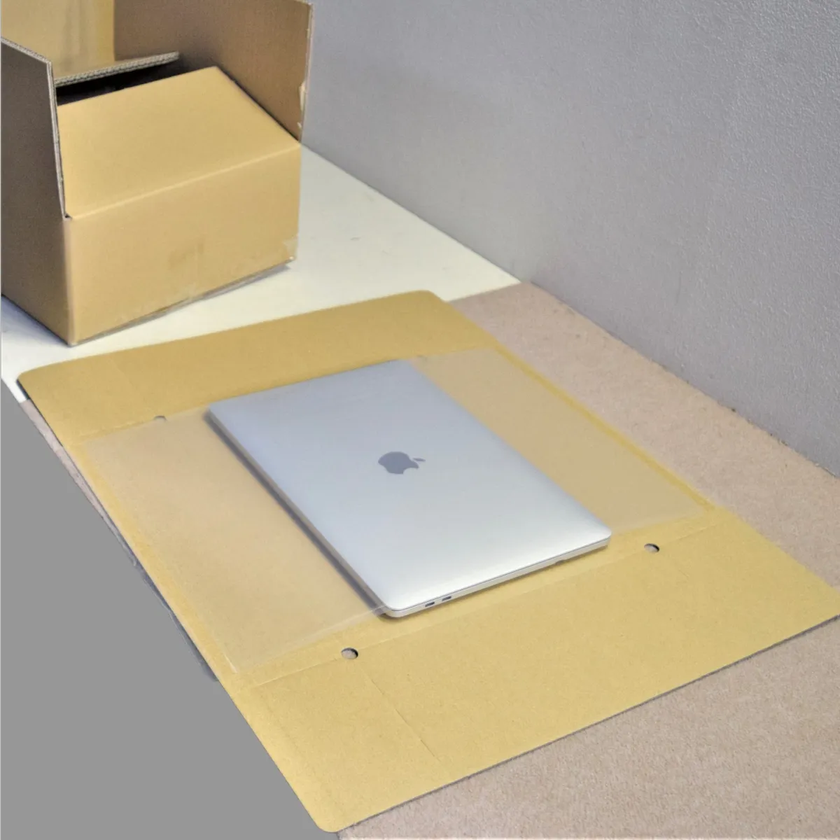 ミナフィットの優れた点は、その柔軟性と耐久性です。伸びる特性を持つポリエチレンフィルムは、様々な形状のパソコンにぴったりとフィットし、衝撃からしっかりと保護します。また、ダンボール紙との一体構造により、高い強度も確保。破損のリスクを軽減し、より安全な梱包を実現しています。