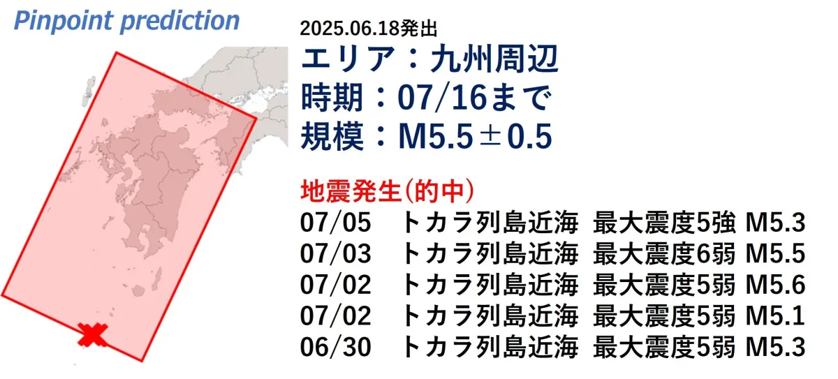 最も最近、2025年7月3日には、トカラ列島近海において震度6弱(マグニチュード5.5)の地震が観測された。この地震は、事前に発表されていた予測と完全に一致した結果となった。