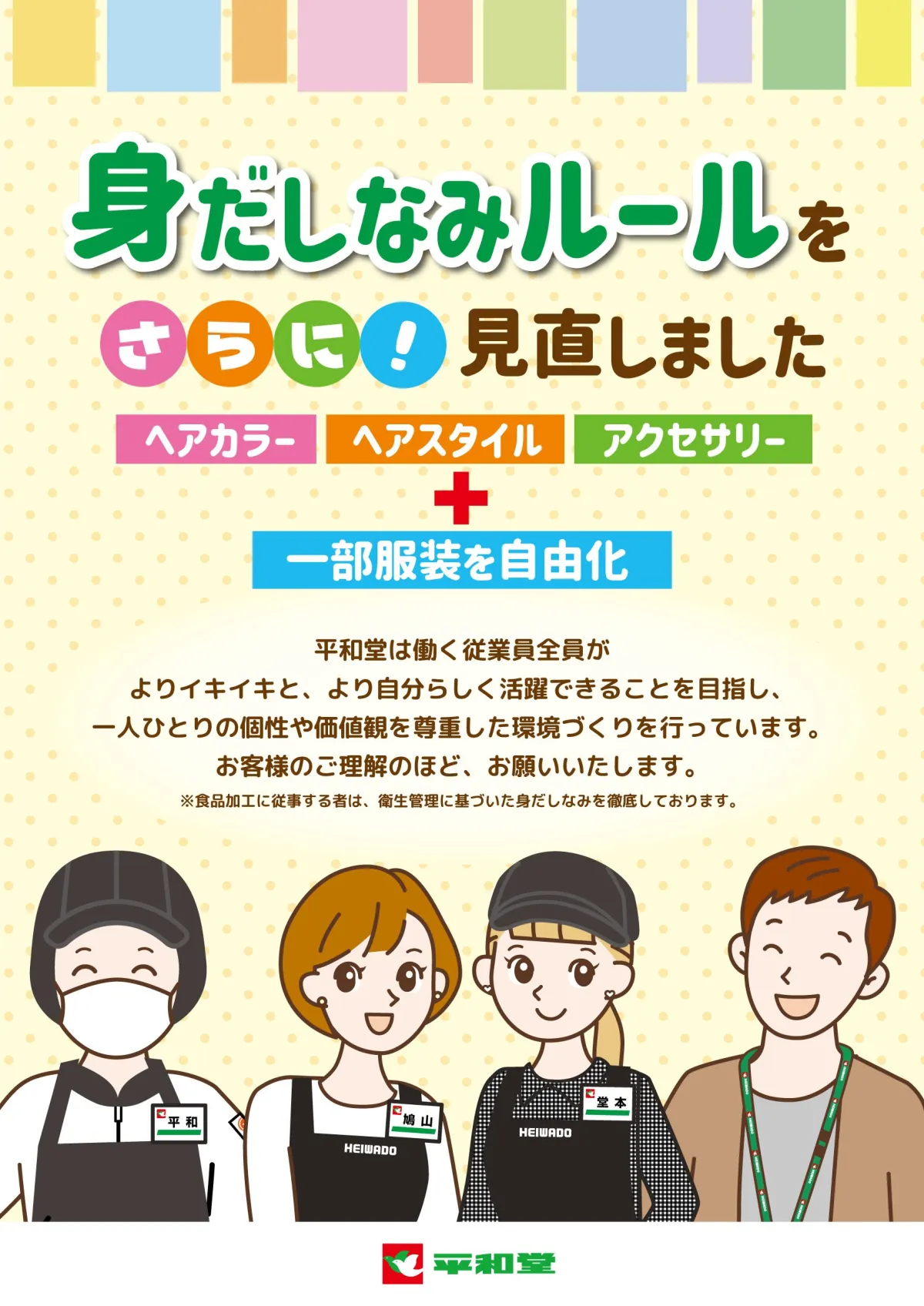 平和堂は従業員が活き活きと働ける環境を整備すべく、昨年の10月にヘアスタイルやアクセサリー、ヘアカラーに関する身だしなみルールを見直しました。今回の服装の自由化は、その延長線上にある重要なステップといえます。