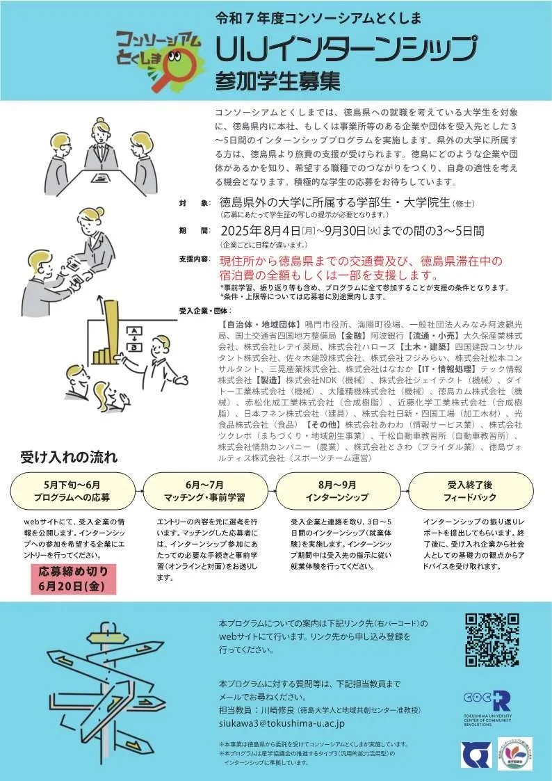 今回のインターンシッププログラムに関する詳細や疑問点については、徳島大学人と地域共創センターや徳島県の経済産業部に直接お問い合わせください。専用のメールアドレスや電話番号が提供されており、わからないことがあれば迅速に問い合わせることができます。参加者の皆さんがスムーズにプログラムに参加できるよう、サポートが充実しています。