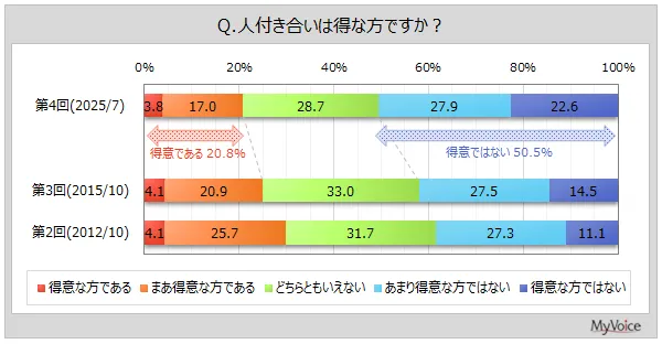 調査によると、人付き合いが得意だと感じている人は全体の約2割強にしか達しておらず、これは2015年の調査と比較して減少しています。特に、30代から50代の男性には人付き合いが得意ではないと感じる人が多く、半数以上を占める結果となりました。これは、中年層が人間関係の構築に苦戦している兆候と言えるでしょう。