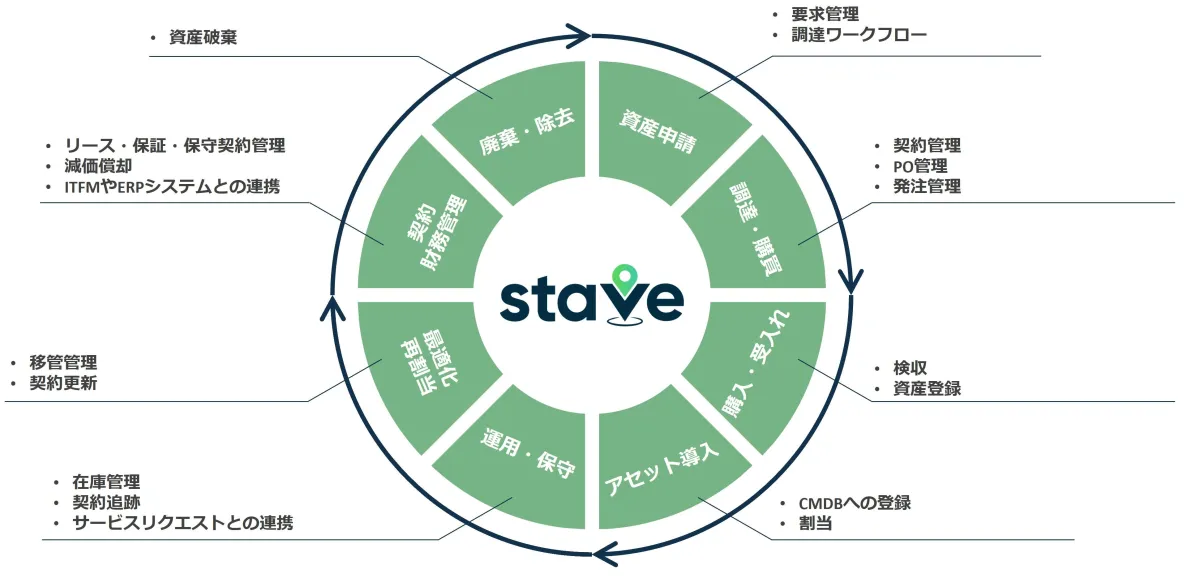Stave Corporationが提供するSaaSソリューションは、調達から資産の廃棄まで、全8フェーズの業務プロセスの一元管理を可能にします。このアプローチにより、企業は運用資産をより戦略的に活用できるようになるため、ビジネス全体の価値が向上することでしょう。