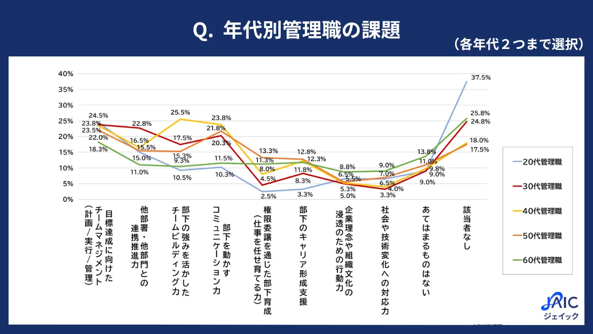 調査によると、若手の20代・30代管理職は「目標達成に向けたチームマネジメント」を主な課題として挙げており、その重要性を強く感じていることが示されました。具体的には、20代では24.5%、30代では23.8%がこの課題を選びました。また、30代管理職においては他部署との連携やコミュニケーション力の不足も課題として挙げられています。これが、業績に直結する課題意識につながっていることが分かりました。
