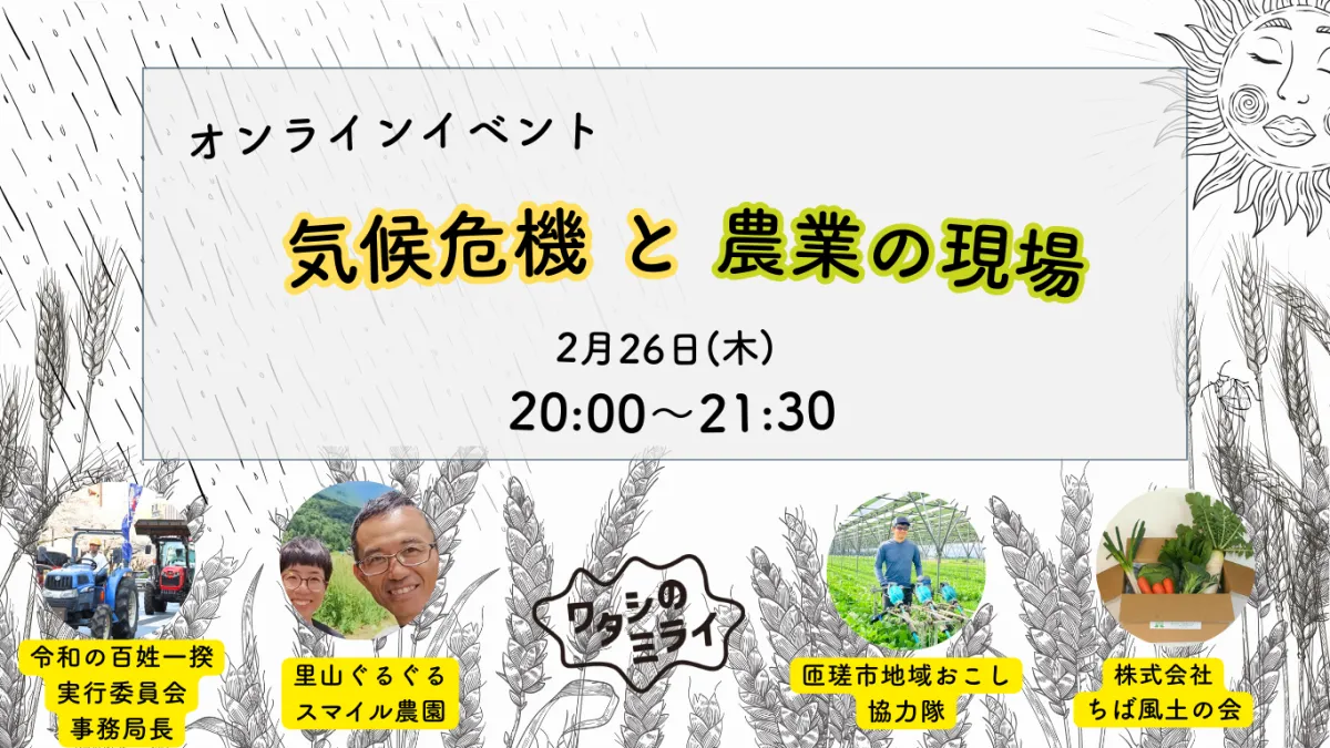 2026年2月26日、20時から21時30分にかけて、気候危機が農業に与える影響について考えるオンラインイベントが開催されます。このイベントは、地球環境の変化が農業現場にどのような影響を及ぼしているのかを農業関係者の声を通じて知ることを目的としています。