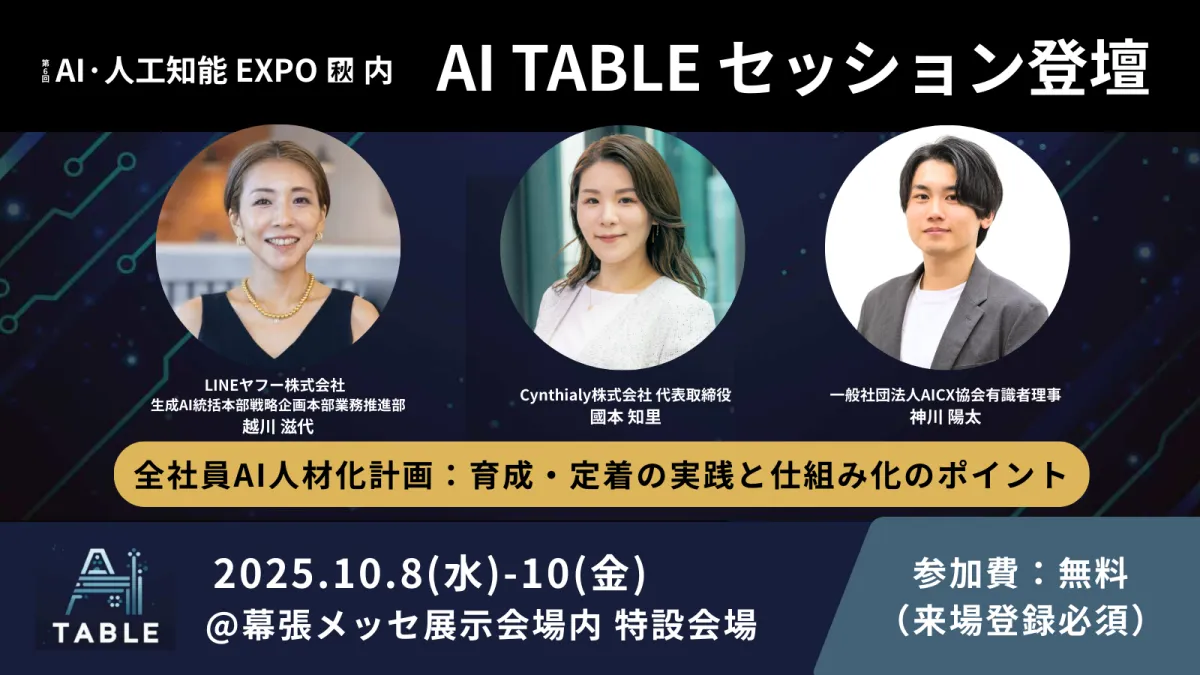 Cynthialy株式会社は、法人向けの生成AI人材育成と定着化支援を行う企業です。今回はその代表である國本知里氏が、AI・人工知能EXPOでの「AI Table」に参加し、生成AIの導入や実践についての議論を行います。