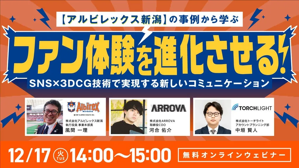 2024年12月17日(火)に、株式会社ARROVA、株式会社トーチライト、及びJリーグのアルビレックス新潟が共催する無料オンラインセミナーが開催されます。このセミナーのテーマは「ファン体験を進化させる!SNS×3DCG技術で実現する新しいコミュニケーション」です。