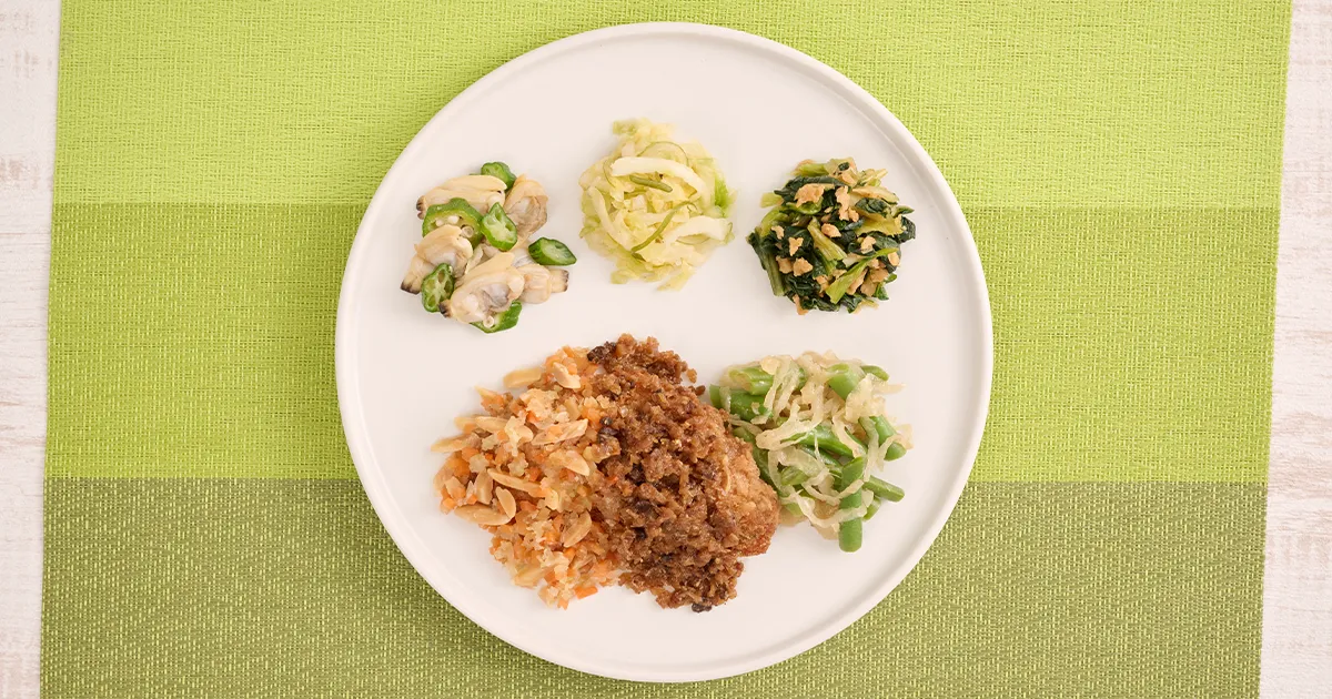 このアジフライには、シャキシャキ感のあるインゲンや玉ねぎ、香ばしいアーモンドのトッピングが添えられており、最後まで飽きずに楽しむことができます。また、副菜には旨みが凝縮されたあさりとオクラの塩だれや、茎わかめの食感がアクセントの和え物が用意されており、栄養バランスにも優れています。