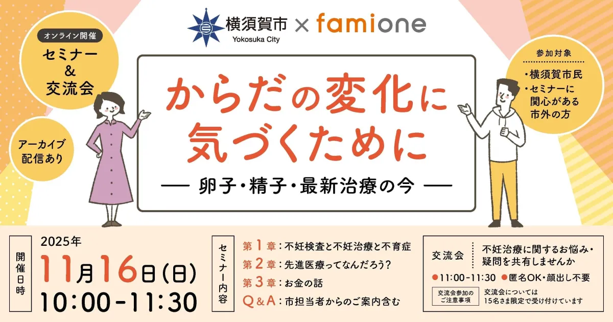 神奈川県横須賀市では、妊活や不妊治療を考えている方々を対象にしたセミナーが来る11月16日に行われます。本セミナーは、LINEを活用した妊活サポートサービス「famione」を提供する株式会社ファミワンが主催し、「子どもを願うすべての人に寄り添い、幸せな人生を歩める社会をつくる」というビジョンのもと、参加者に向けた貴重な情報を提供します。