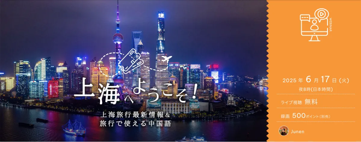 中国語講師のJunenが、最新の上海旅行情報とともに旅行に役立つ中国語を学べるオンラインセミナーを開催します。このセミナーは、2025年6月17日火曜日の夜8時(日本時間)から40分間、ライブ視聴が可能で、参加は無料です。