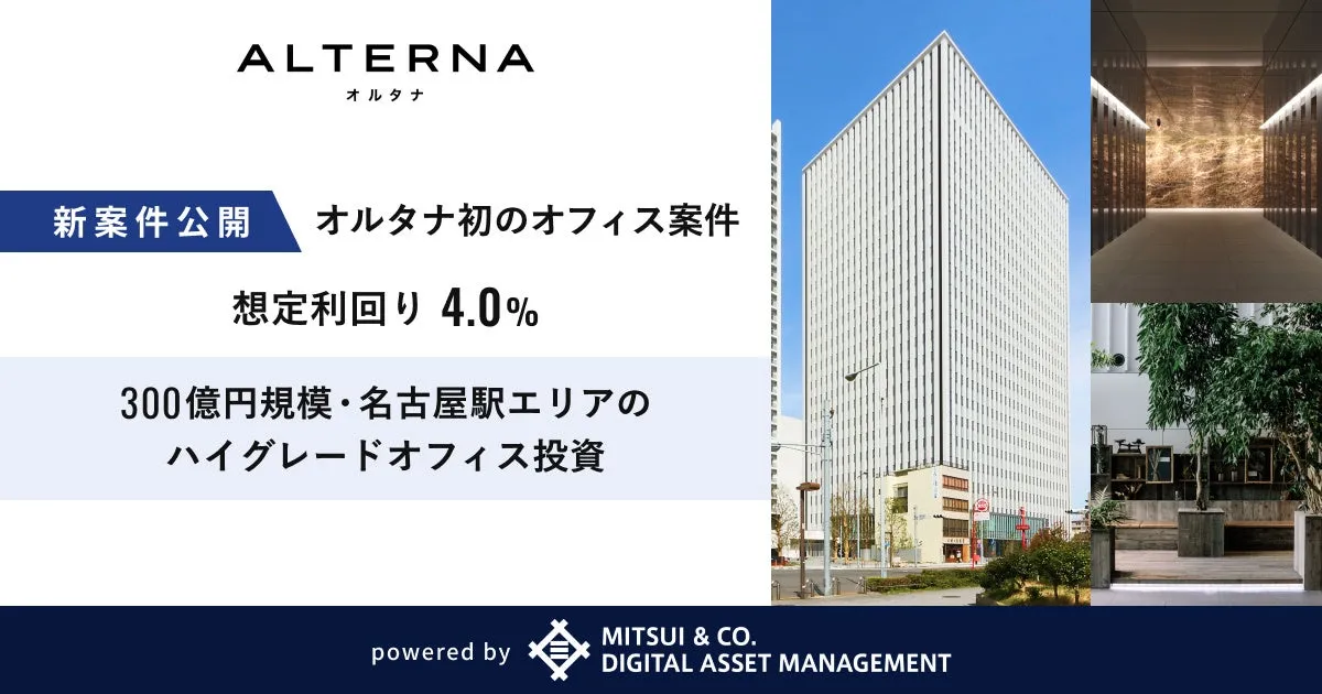 三井物産デジタル・アセットマネジメント株式会社が提供するオルタナティブ投資サービス「ALTERNA(オルタナ)」が、名古屋駅エリアにおける300億円規模のハイグレードオフィスビルへの投資機会を提供開始しました。この投資対象は「名古屋プライムセントラルタワー」として知られ、その評価額は約300億円。名古屋駅から徒歩圏内という絶好のロケーションに位置しているため、今後のさらなる発展が見込まれています。