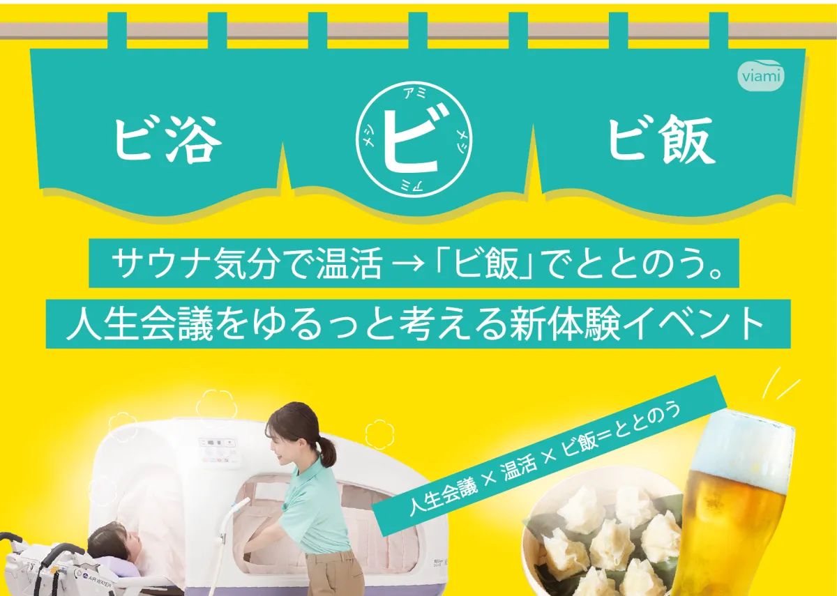 入浴体験の後は、エア・ウォーターが提案する「ビ飯(びめし)」を囲む交流会です。これは、シャワーからの心地よい湯気の中で、身体が整った状態で楽しむ特別な食体験です。参加者同士で感想を語り合いながら、普段の生活やこれからの生き方について自由に話す意義深い時間となることでしょう。