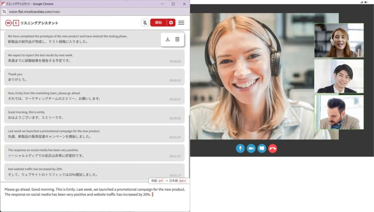 そこで登場したのが、株式会社みらい翻訳が新たに提供する「みらい翻訳 リスニングアシスタント(会議翻訳)」です。このサービスは、会議中の音声をリアルタイムで翻訳し、参加者が言語の壁を気にせず意見を交わすことを可能にします。