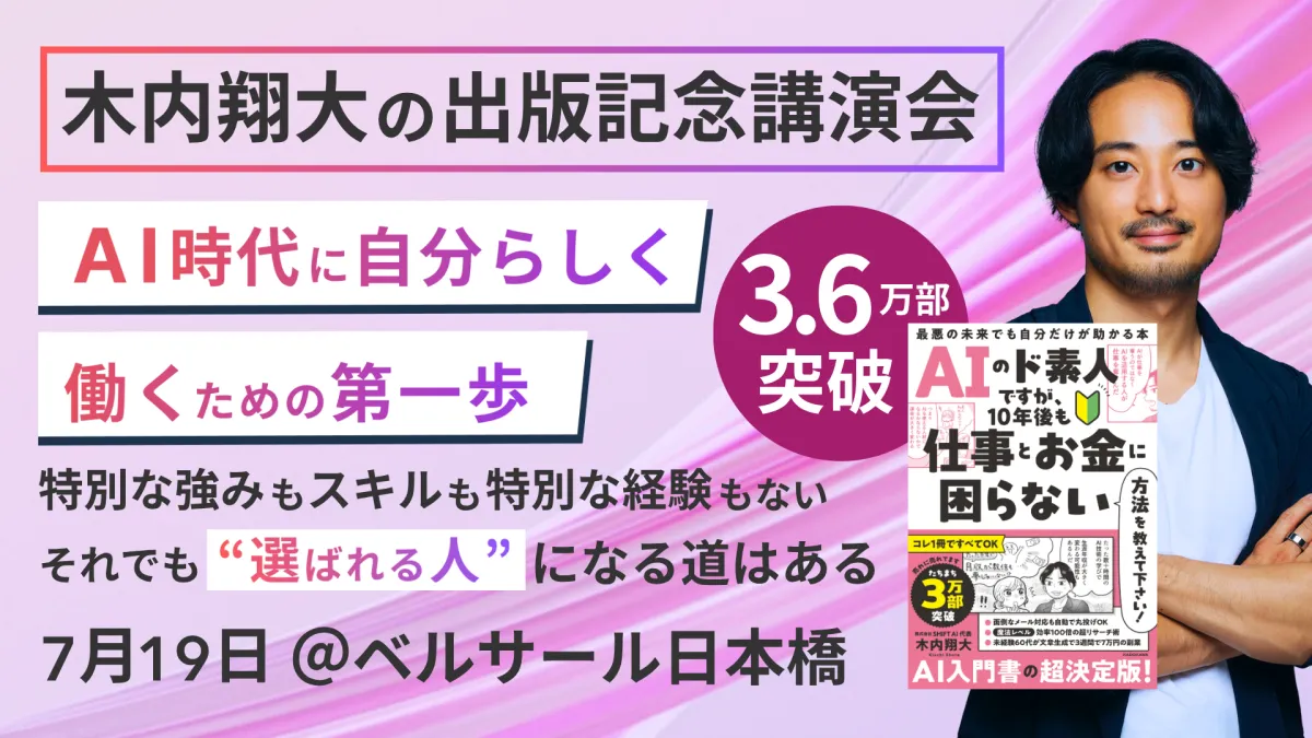 株式会社SHIFT AIの代表取締役、木内翔大氏の新著『AIのド素人ですが、10年後も仕事とお金に困らない方法を教えて下さい! 最悪の未来でも自分だけが助かる本』(KADOKAWA発行)が、発売からわずか2か月で累計3.6万部を突破しました。この書籍は、AIの普及に伴う不安を抱えるビジネスパーソンに向けて、具体的な行動計画を提案するものです。そして、2025年7月19日には、東京・日本橋の「ベルサール日本橋」にて出版記念講演会が開催されました。