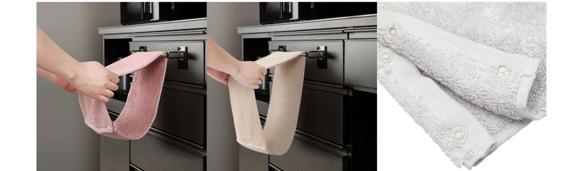 このタオルは、発売以来累計約14万枚を売り上げた実績を持ちます。特徴は両端に付けられたボタンによってループ状になり、タオルバーから脱落しにくいため、いつでも乾いた部分で手を拭くことができます。