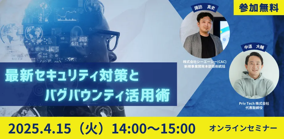 そこで、2025年4月15日(火)14時より、株式会社CACとPriv Tech株式会社の共催でウェビナー『最新セキュリティ対策とバグバウンティ活用術』が開催されます。このセミナーでは、最新のサイバー攻撃の実態が具体的な事例を基に解説され、企業が実施すべき効果的なセキュリティ対策が紹介されます。