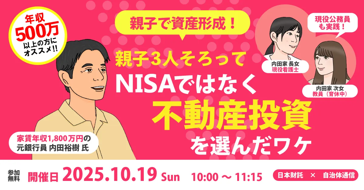 2025年10月19日(日)に開催されるオンラインセミナー「親子で資産形成!親子3人そろってNISAではなく不動産投資を選んだワケ」は、多くの公務員の方々にとって、資産形成について考える絶好の機会となります。このセミナーは日本財託と自治体通信が共催し、リアルな投資体験を持つ親子が登場します。