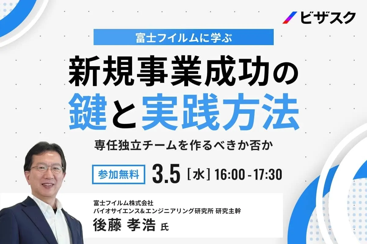 2024年3月5日(水)16:00から、株式会社ビザスクが主催するオンラインセミナーが開催されます。このセミナーでは、富士フイルム株式会社の後藤孝浩氏をメイン講師に迎え、新規事業成功の鍵や実践方法についての具体的な解説が行われます。