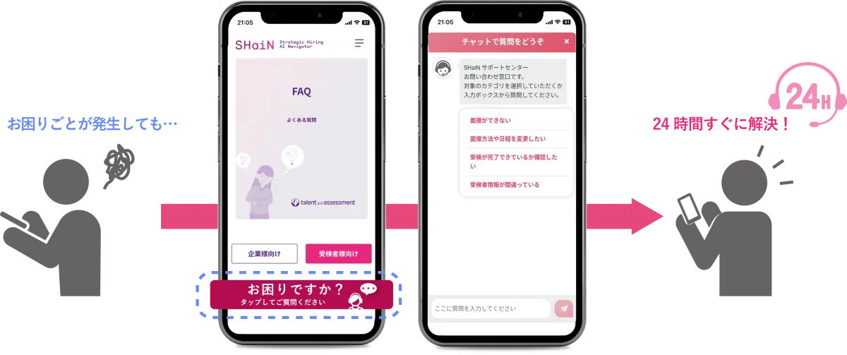 SHaiNはこれまで、システムや操作に関する問い合わせをメールや電話で処理していましたが、対応時間が限られていたため、受検者が不安を感じることもありました。特に夜間や早朝に面接を受ける方にとっては、そのタイムラグがストレスの一因となっていたのです。しかし、チャットボットを導入することで、受検者は24時間、即時にサポートを受けることができるようになりました。