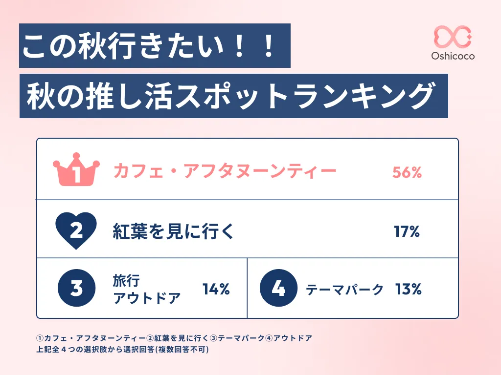 今回の調査から、推しと共に特別な思い出を作り上げるために、ファンたちがどのような秋の経験を大切にしているのかが見えてきました。カフェでのアフタヌーンティーや紅葉狩り、映画館やテーマパークでのイベント参加など、秋の季節を精一杯楽しむ姿勢が強く感じられます。