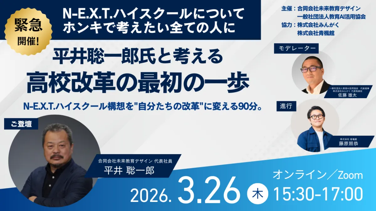 株式会社みんがくが、平井聡一郎氏を招いたオンラインセミナー「平井聡一郎氏と考える高校改革の最初の一歩」を開催します。本イベントは、教育改革の具体的なアクションを90分という短時間で考える実践的なプログラムです。