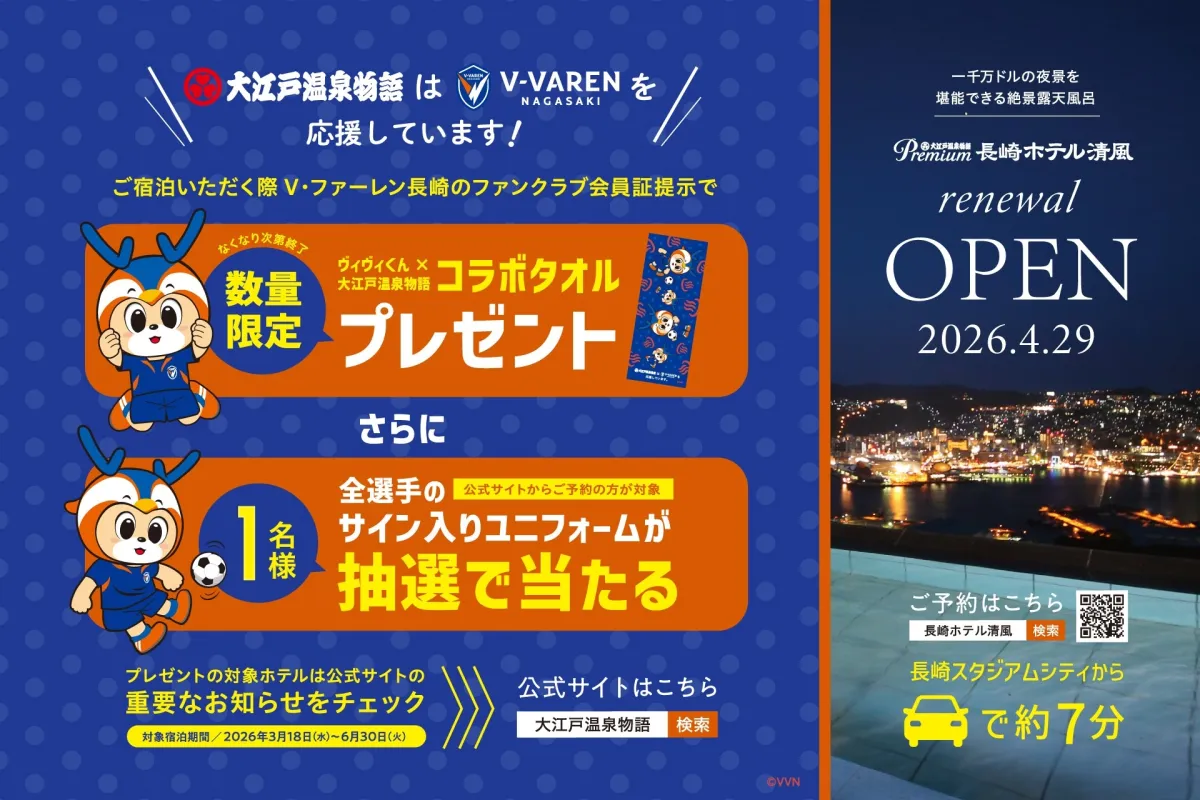大江戸温泉物語グループが、プロサッカークラブV・ファーレン長崎と新たにパートナー契約を結び、素晴らしいキャンペーンを実施します。このコラボレーションの一環として、特別なプレゼント企画が始まりました。2026年の春から夏にかけて、長崎県内の特定のホテルに宿泊する方々に向けて、限定のオリジナルコラボタオルや全選手のサイン入りユニフォームが当たるチャンスがあります。