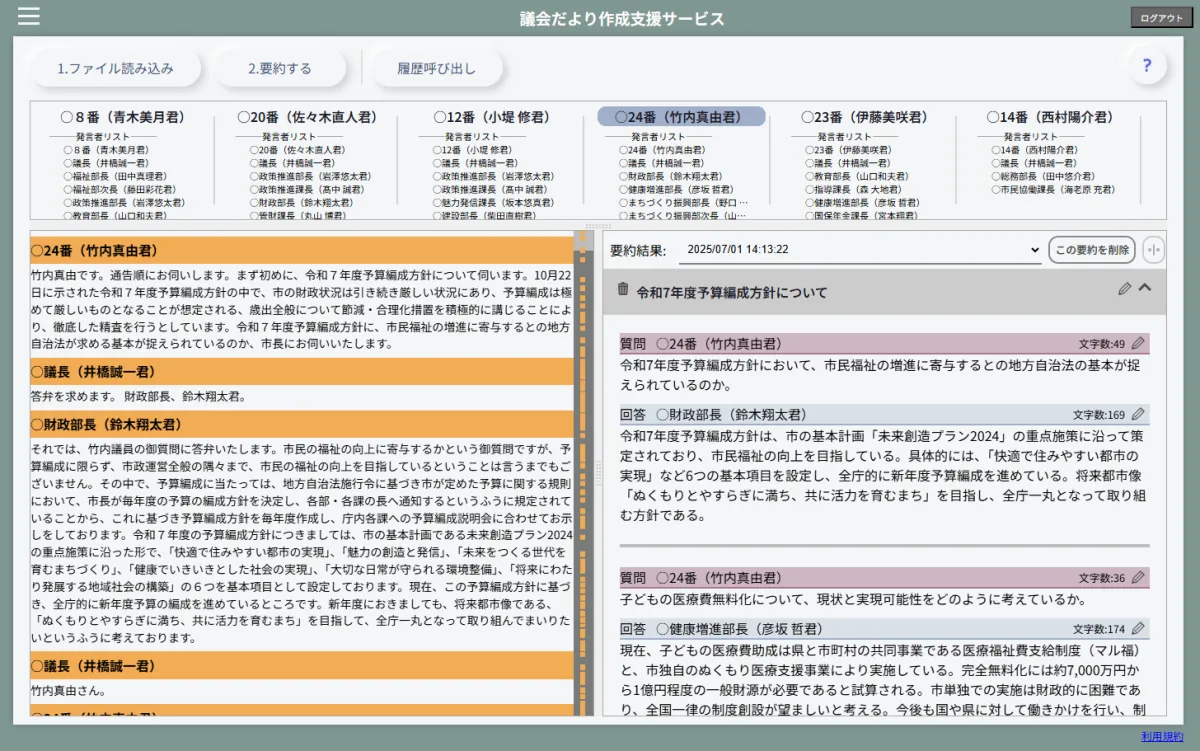 新サービスでは、AI音声認識AmiVoiceが生成した議事録を「Azure OpenAI Service」を利用して、一問一答形式に要約します。具体的には、議会の一般質問の議事録データをアップロードすると、各議員の発言が自動的に振り分けられます。これにより、複雑なプロンプト入力をすることなく、迅速に要約を生成できるのです。