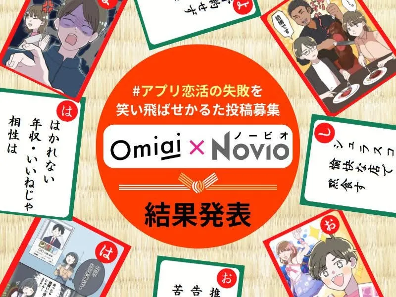 恋愛や婚活を支援する株式会社KADOKAWAが運営する恋活・婚活サポートサイト『NOVIO』と、マッチングアプリ『Omiai』が共同で「#アプリ恋活の失敗を笑い飛ばせかるた投稿キャンペーン」を開催しました。このキャンペーンでは、クリスマスや年末年始を前に新しい恋に向けての活性化を目指し、多くの皆さんから底抜けにユーモラスなエピソードが寄せられました。