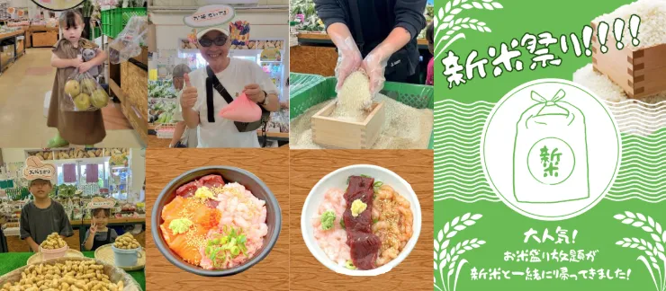 特に注目されるのは、農産物コーナーで行われる「新米祭り」です。千葉県産のブランド米「粒すけ」を使った米の盛り放題イベントがあり、30秒間にどれだけ多くの米を五合升に盛り込むことができるか挑戦する企画。お米は1回500円で体験でき、1kg以上の米を手に入れることができる可能性も!