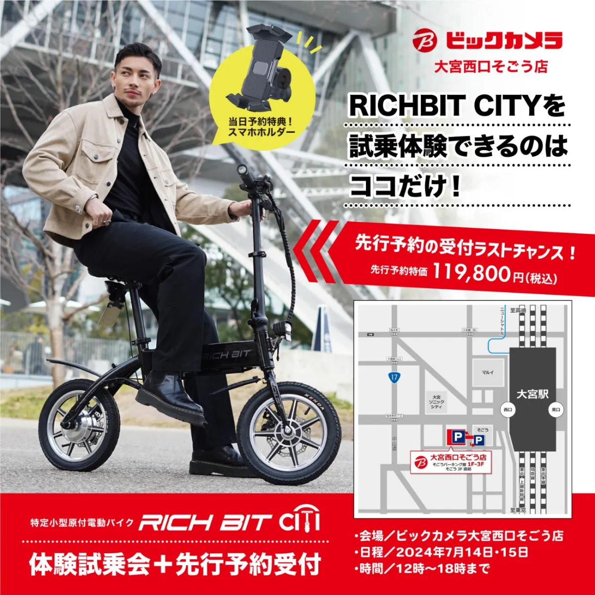 株式会社Acalieが展開する新型特定小型原動機付自転車「RICHIBIT CITY」の体験試乗会&先行予約受付イベントが、7月14日(日)・15日(月)の2日間、ビックカメラ大宮西口そごう店で開催されます。