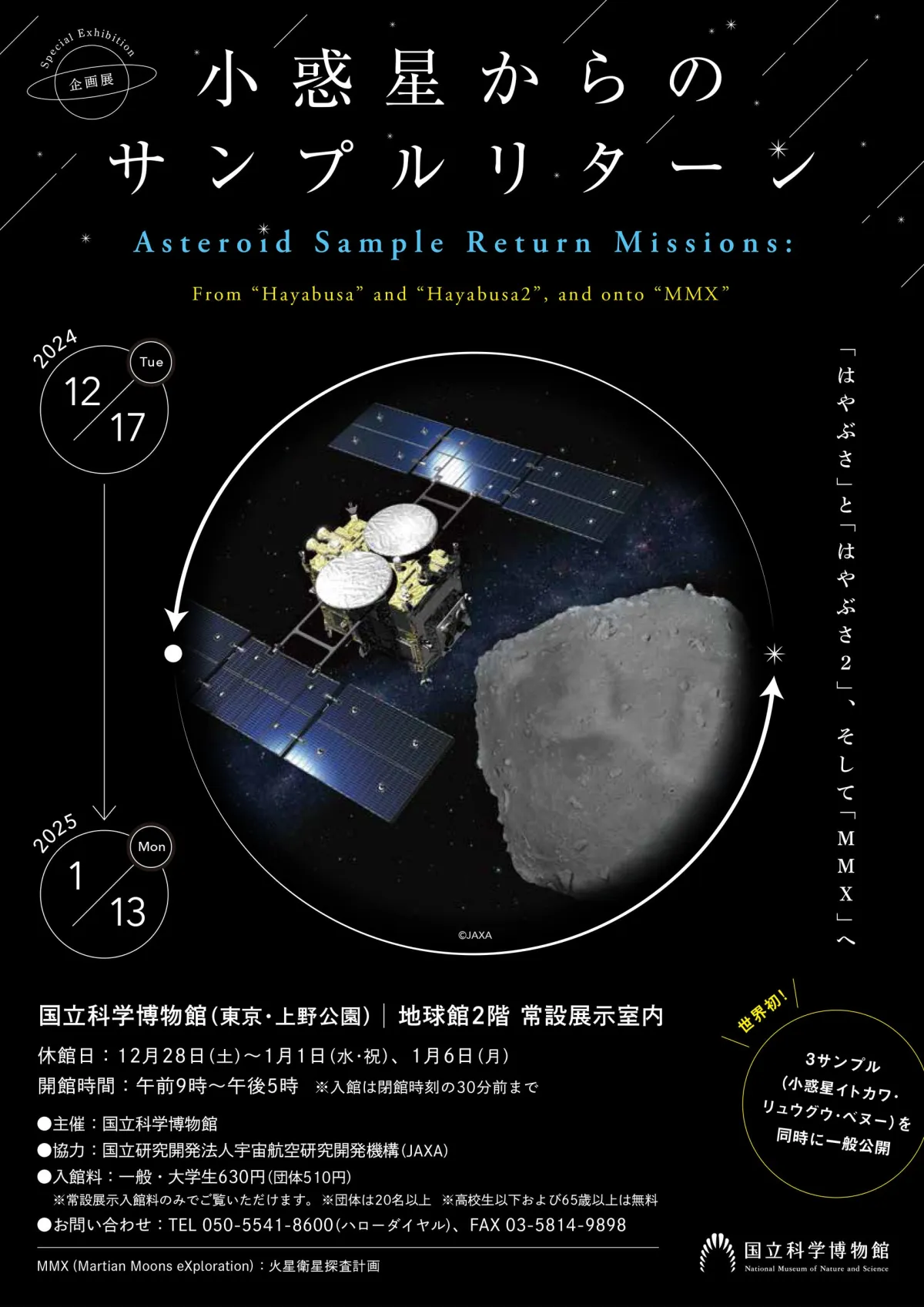 2024年12月17日から2025年1月13日まで、国立科学博物館にて「小惑星からのサンプルリターン-「はやぶさ」と「はやぶさ2」、そして「MMX」へ-」という特別展が開催されます。この展示では、世界初となる3つの小惑星(イトカワ、リュウグウ、ベヌー)のサンプルが同時に一般公開されることが話題となっています。展示の背景には、国立研究開発法人宇宙航空研究開発機構(JAXA)の協力が重視されています。