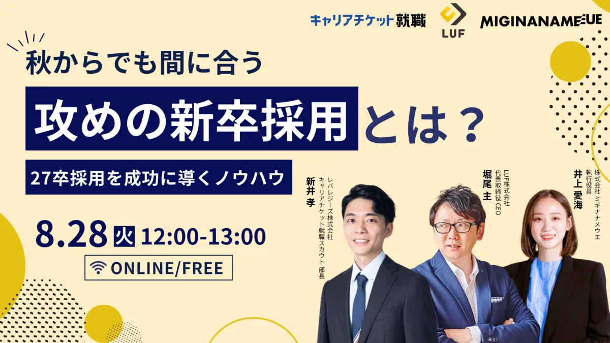 2025年8月28日、LUF株式会社とレバレジーズ株式会社、株式会社ミギナナメウエが共同で、新卒採用をテーマにした無料オンラインセミナー『秋からでも間に合う「攻めの新卒採用」とは?27卒採用を成功に導くノウハウ』を開催します。