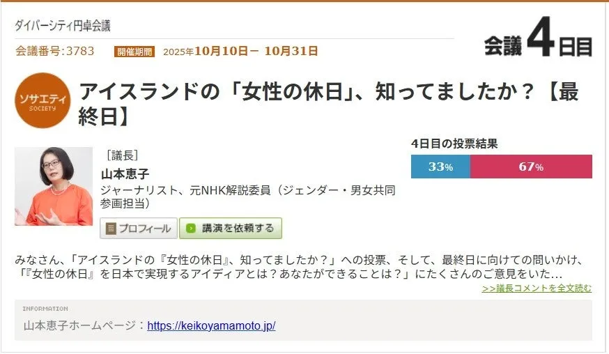 第1日目から第4日目を通じて、さまざまな意見が交わされました。第2日目では、参加者の約3割が「女性の休日」を知っており、「ぜひ日本でも実施してほしい」という声が上がりました。これに対し、山本氏は「もし日本で女性が1日休んだら、社会はどうなるか」というテーマで話を進めました。