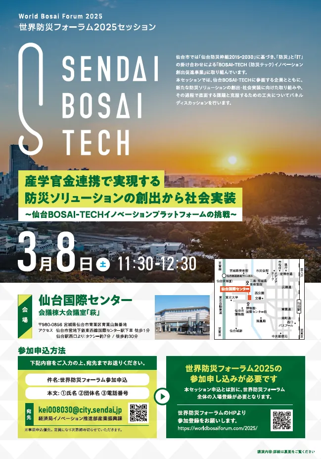 特に注目すべきは、2025年3月8日(土)に行われるセッション「産学官金連携で実現する防災ソリューションの創出から社会実装」です。このセッションでは、仙台BOSAI-TECHに加盟する企業が防災ソリューションの開発に向けた取り組みを紹介し、実用化の過程で直面する問題を共有し、解決策を模索します。特に、産学官金の各セクターが連携し、各自の知見を持ち寄ることで生み出されるシナジー効果に期待が寄せられています。