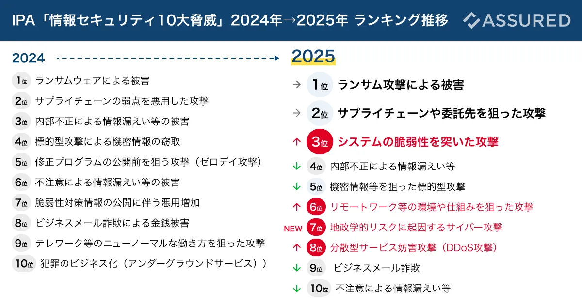 株式会社アシュアードが運営するセキュリティ評価プラットフォーム「Assured」は、IPA(独立行政法人情報処理推進機構)が発表した「情報セキュリティ10大脅威 2025」の解説レポートを公開しました。このレポートは、2025年における情報セキュリティ分野のリスクを理解するための重要な指標となっており、多くの企業や研究者にとって参考にされる内容となっています。