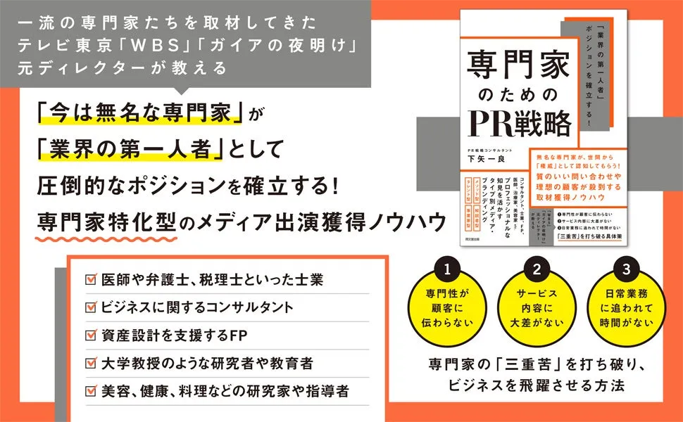 『専門家のためのPR戦略』は、専門家がメディアでの露出を増やし、自身のビジネスを拡大するための実践的なガイドです。士業や治療家、教育者、料理研究家など、様々な立場の専門家が自信を持ってメディアにアプローチできるよう、その知識をこの一冊で手に入れましょう。