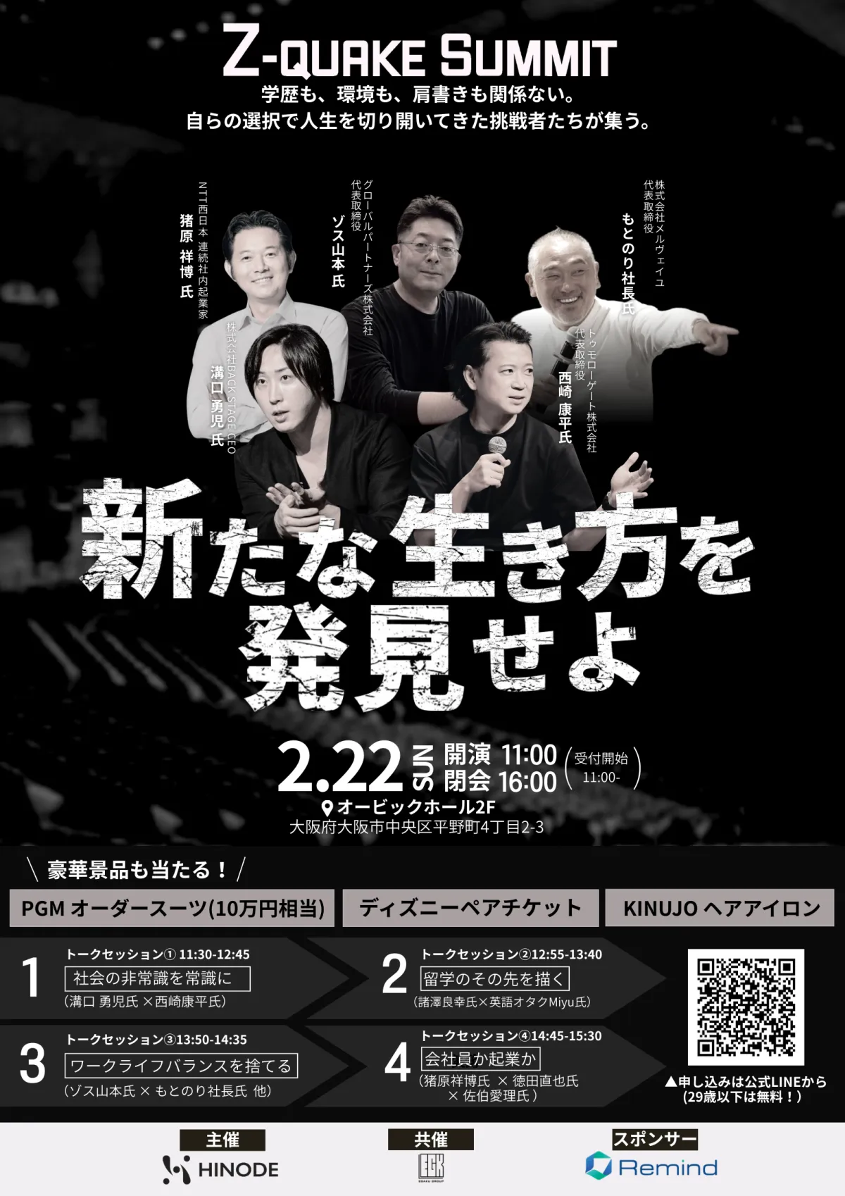 2026年2月22日、関西Z世代の底上げを目指したキャリアイベント『Z-QUAKE SUMMIT Vol.3』が、大阪のオービックホールにて開催されます。このイベントは、700名を収容可能な会場で、業界トップの起業家によるトークセッションや、Z世代の参加者によるピッチ、企業との交流ブースなど、多彩なプログラムが用意されています。