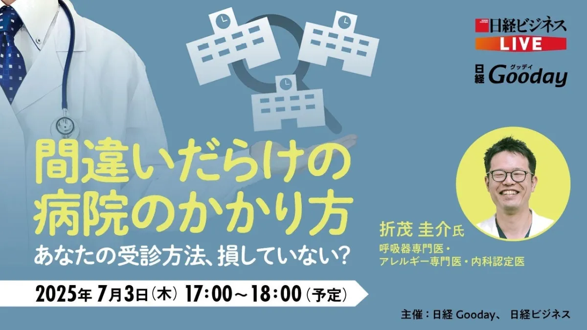 2025年7月3日(木)に開催されるウェビナー「間違いだらけの病院のかかり方~あなたの受診方法、損していない?~」に、医師折茂圭介が登壇することが明らかになりました。このイベントは、日経Goodayと日経ビジネスが共催するオンラインセミナーです。折茂医師は、呼吸器専門医、アレルギー専門医、内科認定医としての豊富な知識と経験を活かし、参加者に医療機関の賢い利用方法を伝授します。