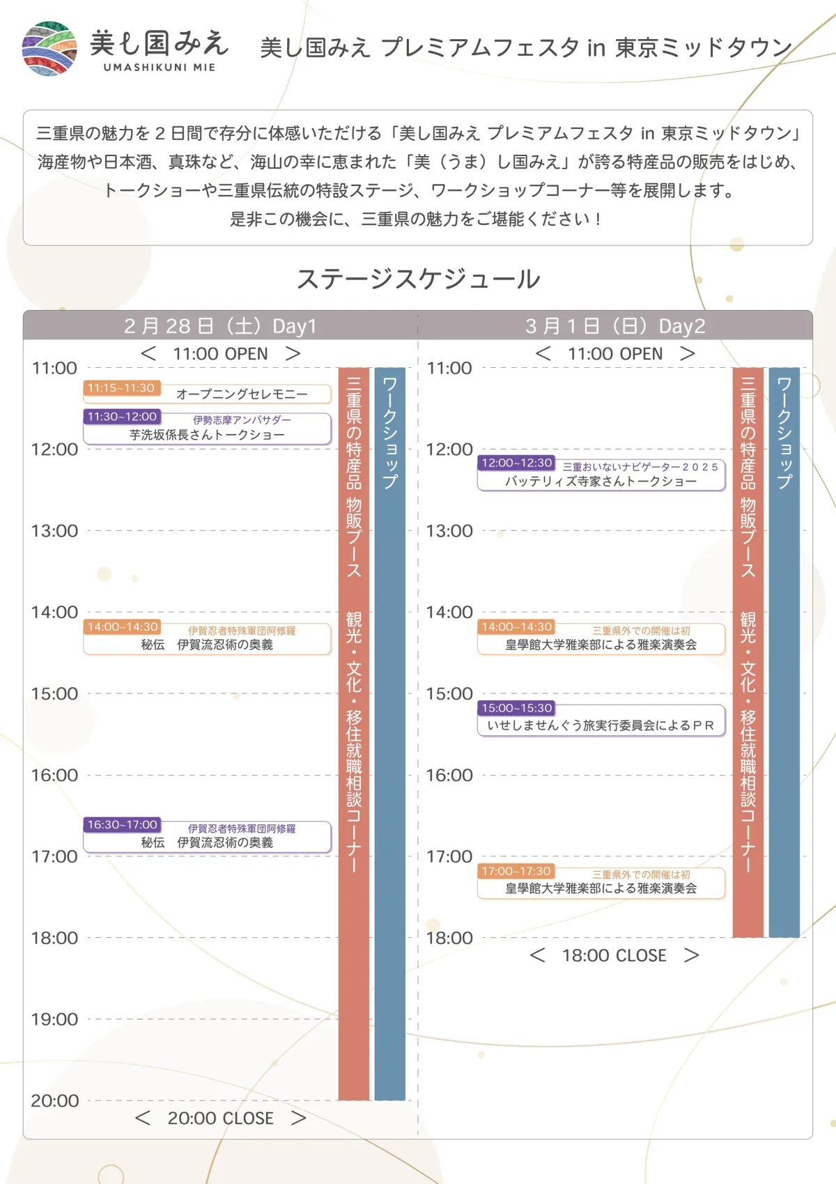 ステージではトークショーや雅楽の演奏など、三重県の文化を紹介するエンターテインメントも行われます。また、三重の観光情報や斎宮に関する内容を発信するための「観光ブース」や「文化ブース」も設けられ、移住や就職に関する相談ができる「相談ブース」も設置されます。
