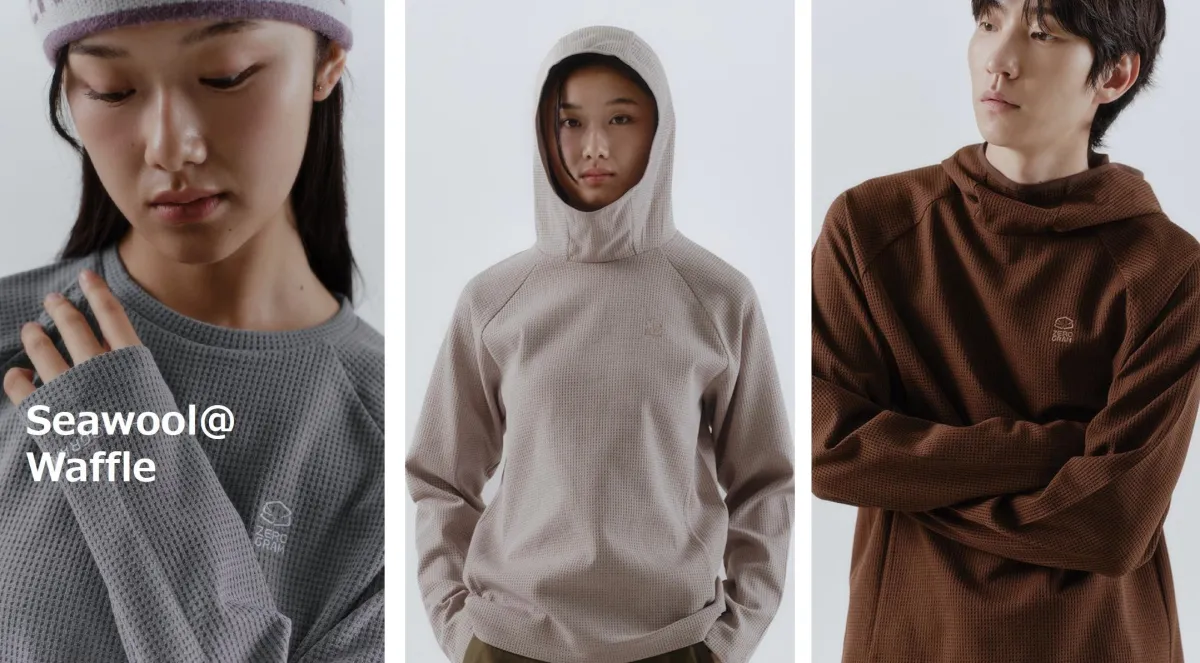「SEAWOOL Waffle」シリーズには、保温性を高めたフーディータイプと汎用性のあるラウンドネックタイプの2種類が用意されており、どちらもワッフル構造によって優れた通気性を実現。身体を快適に保ちながら、肌への張り付きも軽減します。また、UVカット機能や抗菌防臭、静電気防止などの追加機能により、あらゆるシーンで快適に着用可能です。