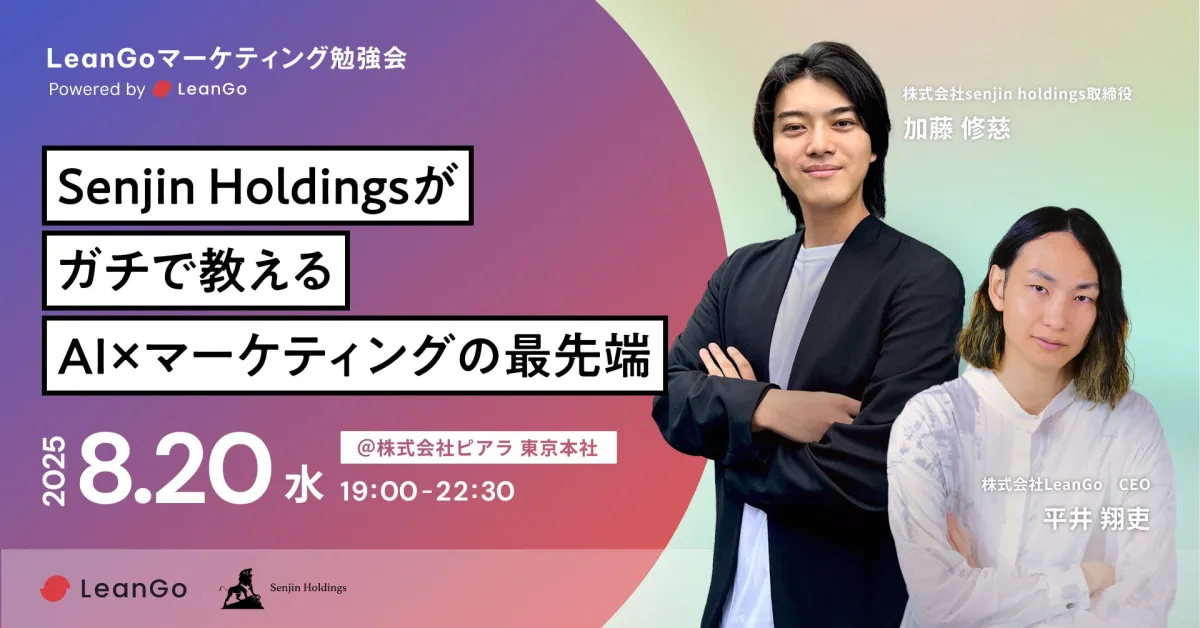 2025年8月20日(水)、株式会社LeanGo主催の無料オフライン勉強会が開催されます。このイベントは「AI×マーケティングの最前線」をテーマに、Senjin Holdingsの加藤修慈氏をゲストに迎え、最先端の知識を学ぶことができる貴重な機会です。