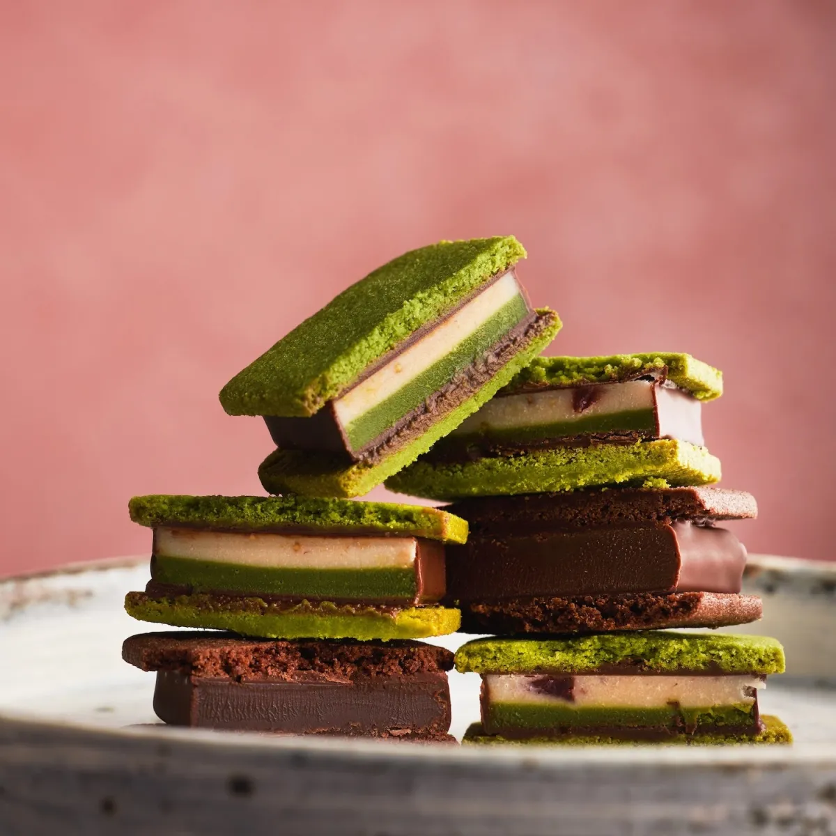 使用されているチョコレートは、横浜市内の工房で自社製造されたホワイトチョコレートとビターチョコレートです。ホワイトチョコレートには厳選されたカカオバターを使用し、抹茶やいちごの香りを引き立てる優しい甘さが特徴です。一方、ビターチョコレートはガーナ産とエクアドル産のカカオをブレンドしており、抹茶のほろ苦さとの相性が絶妙です。また、クッキーは初めて宇治抹茶を使用して作られ、焼き加減にも細心の注意が払われています。