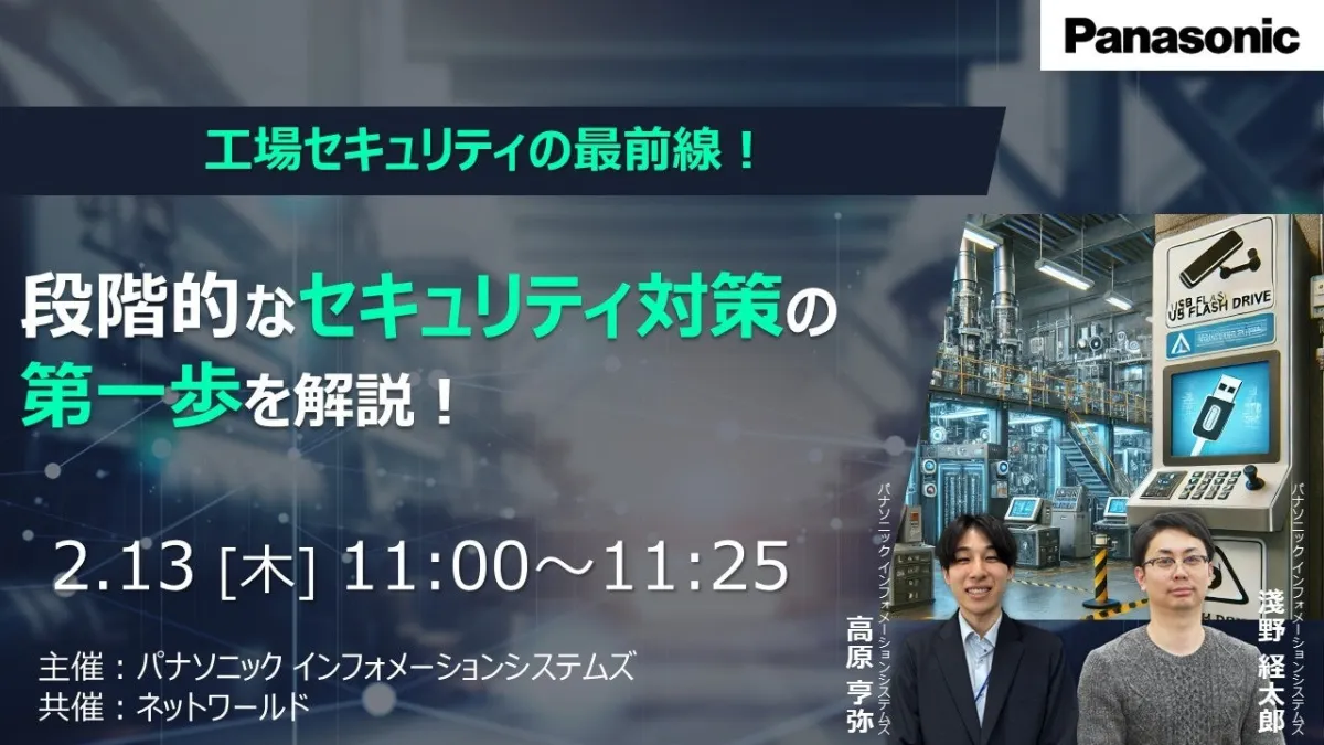 2025年2月13日(木)の午前11時から11時25分に、工場セキュリティに関するウェビナーが開催されます。このウェビナーは、パナソニック インフォメーションシステムズ株式会社が主催し、参加費は無料で、オンライン形式で行われます。