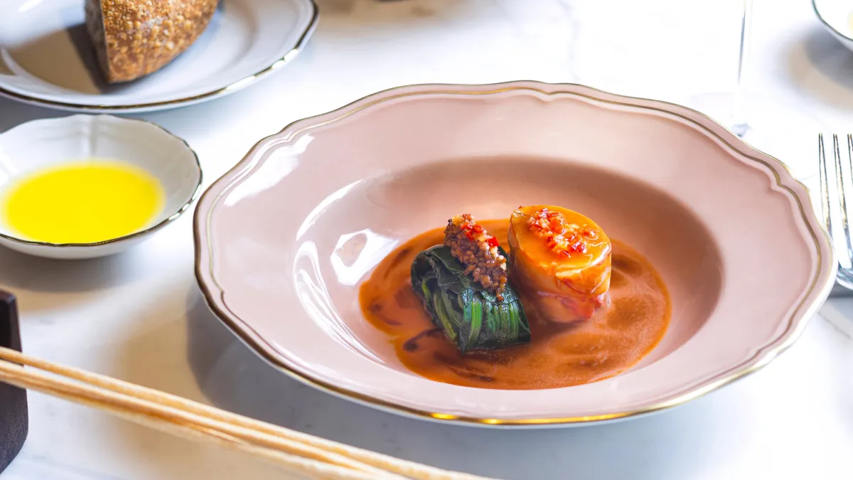 2つ目は、「伊勢海老の煮込み ほうれん草とそばの実 唐辛子のアクセント」。伊勢海老の豊かな旨みを活かして、香りと味わいのレイヤーを絶妙に重ねた料理です。そば茶の香ばしさが日本らしさを感じさせる中、伊勢海老の弾力と自然な甘味が際立ち、見事なハーモニーを生み出しています。