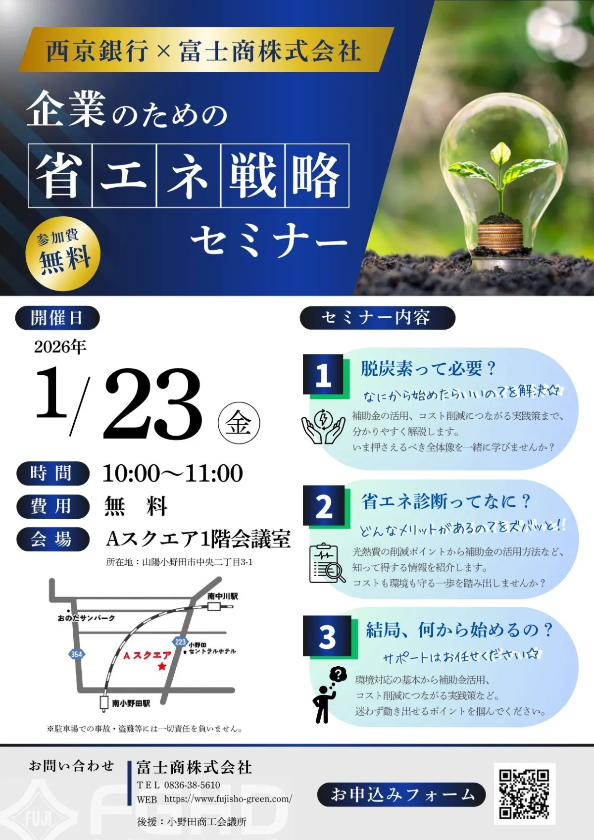 山口県山陽小野田市に拠点を置く富士商株式会社が、2026年1月23日(金)に西京銀行とタッグを組み、「企業のための省エネ戦略セミナー」を開催します。このセミナーでは、脱炭素が進む現代において企業が抱える悩みを解決するための実用的な情報を提供します。