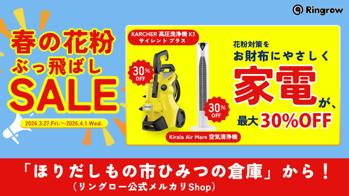リユースPCの販売を行うリングロー株式会社は、2026年3月27日から4月1日までの間、「春の花粉ぶっ飛ばしセール」を実施します。このセールは、花粉シーズンに特に需要が高まる家電製品を、リユース品としてお得な価格で提供することを目的としています。