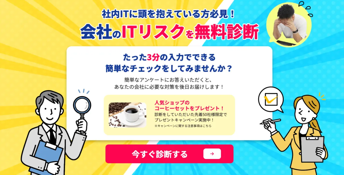 さらに、診断を受けた先着50社には、「人気ショップのコーヒーセット」がプレゼントされるキャンペーンも実施中です。自社のIT環境を見直しつつ、美味しいコーヒーを楽しむチャンスを逃さないでください。