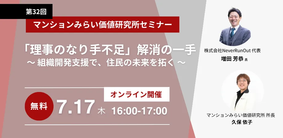 2025年7月17日、まだ先の話ですが、マンションの未来について考える無料ウェブセミナーが開催されます。このイベントは、大和ライフネクスト株式会社が主催する「マンションみらい価値研究所」によるもので、テーマは「理事のなり手不足解消の一手~組織開発支援で、住民の未来を拓く~」。このセミナーは、マンション管理に関わるすべての人々にとって重要な情報を提供する機会です。